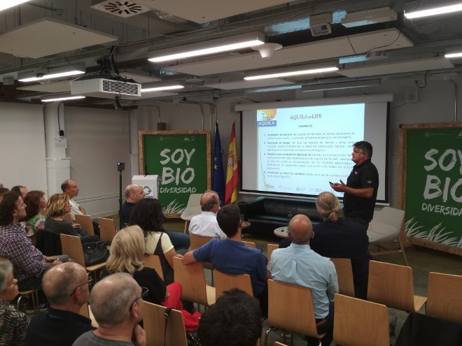 La sede de la Fundación Biodiversidad, en pleno barrio madrileño de Embajadores, fue el punto de encuentro de un evento que se inició con una presentación a cargo de Ignacio Torres, subdirector de la Fundación Biodiversidad, y Miguel Aymerich, subdirector general de Biodiversidad y Medio Natural del Ministerio para la Transición Ecológica. Acto seguido intervino Ernesto Álvarez, presidente de GREFA, explicó los objetivos y los resultados alcanzados hasta el momento por el proyecto AQUILA a-LIFE. GREFA es la ONG que coordina este proyecto europeo en el que participan organismos y entidades de España, Italia y Francia. A continuación tomó la palabra Francisco Márquez, director del vídeo, que comentó las características de su producción y algunos detalles interesantes sobre la fase de realización de este trabajo, que incluye imágenes espectaculares del hábitat donde nidifica el águila de Bonelli y de las zonas donde trabaja AQUILA a-LIFE en la Comunidad de Madrid, Mallorca, Navarra, Álava y Cerdeña.